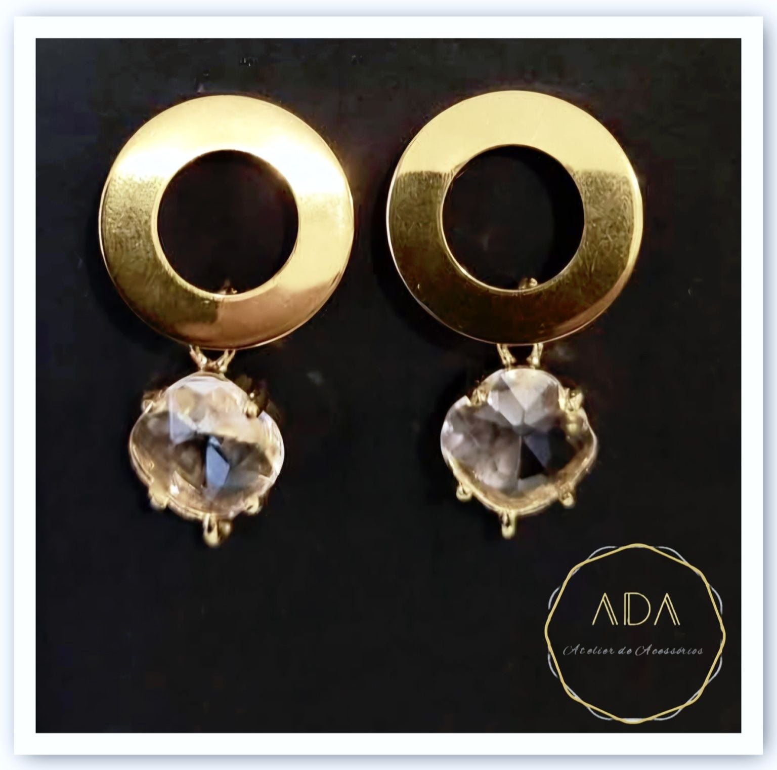 Ousados e elegantes, os Brincos Soláris destacam-se pelo seu design circular em aço inoxidável dourado, com um cristal transparente suspenso que capta e reflete a luz com sofisticação. Uma peça versátil e intemporal, perfeita para quem gosta de marcar presença com brilho e classe.