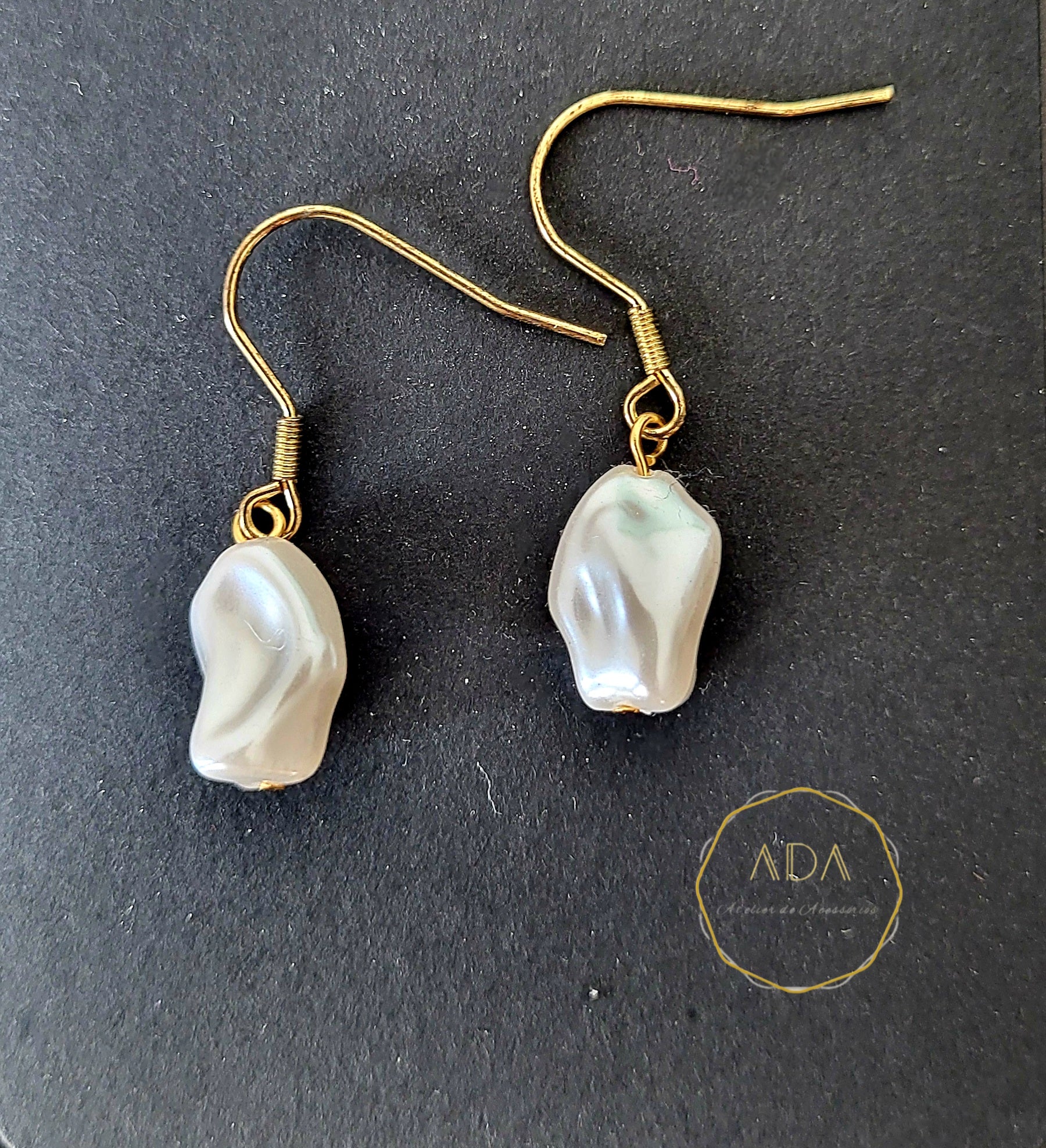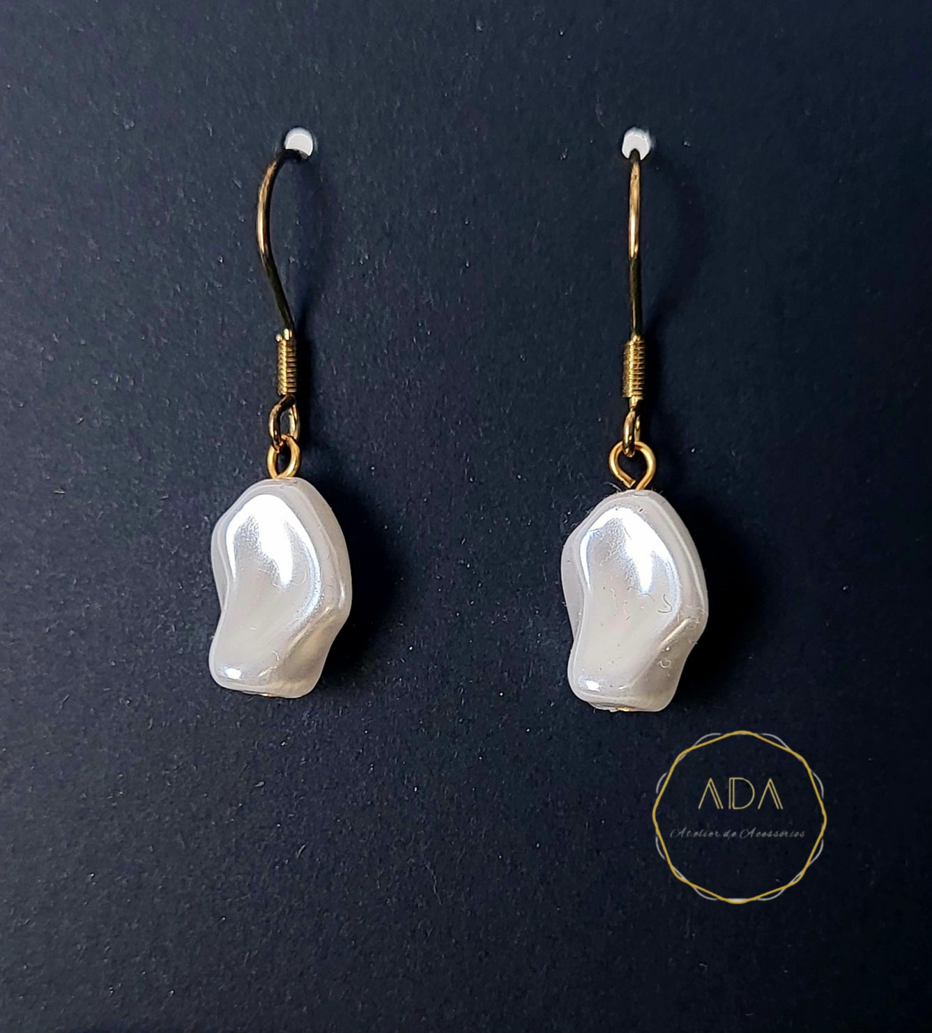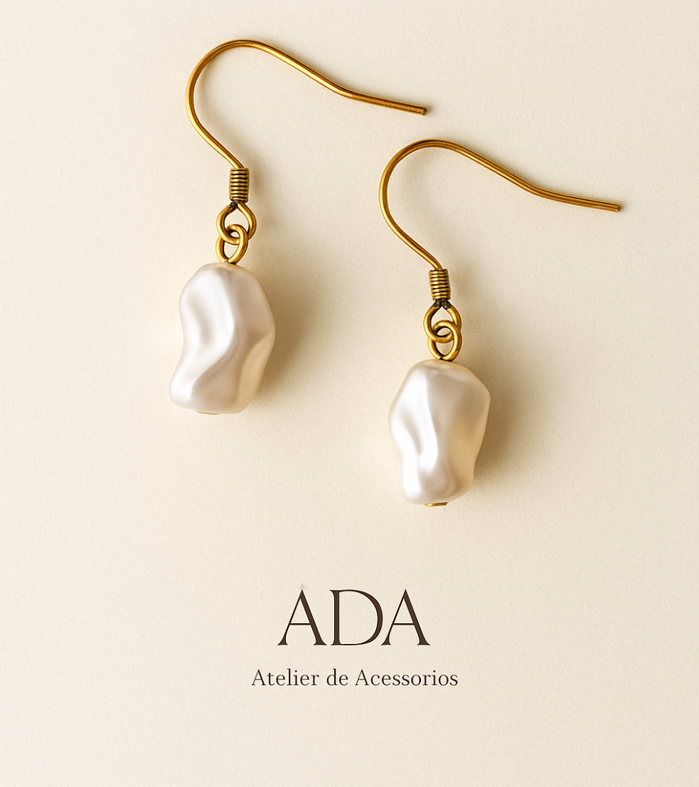 Brincos pendentes com gancho dourado e contas peroladas irregulares, inspirados na beleza orgânica da natureza. Uma peça leve, minimalista e elegante, ideal para o dia a dia ou ocasiões especiais.